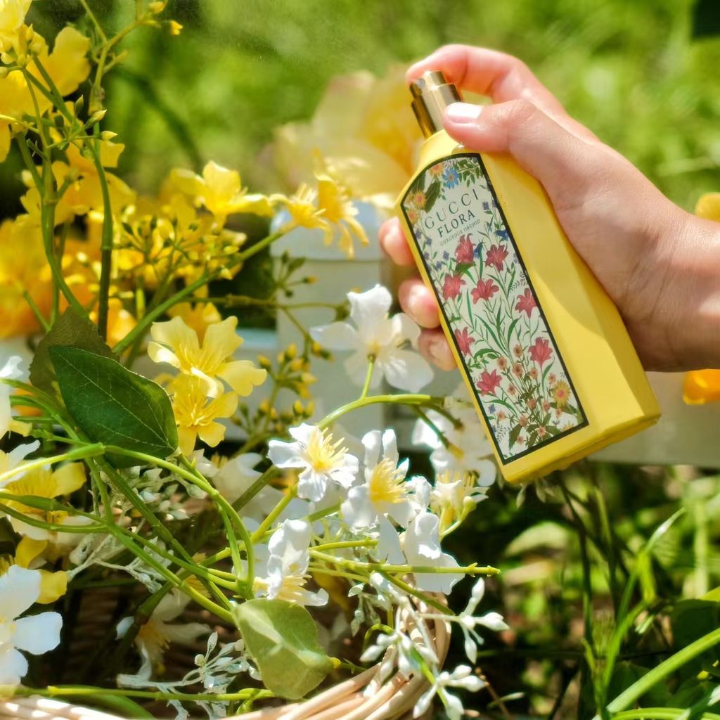 花瓶散發著永恆的精緻——一個光滑的金色玻璃瓶,裝飾著標誌性的Gucci Flora標誌,反映了現代而浪漫的美學。
