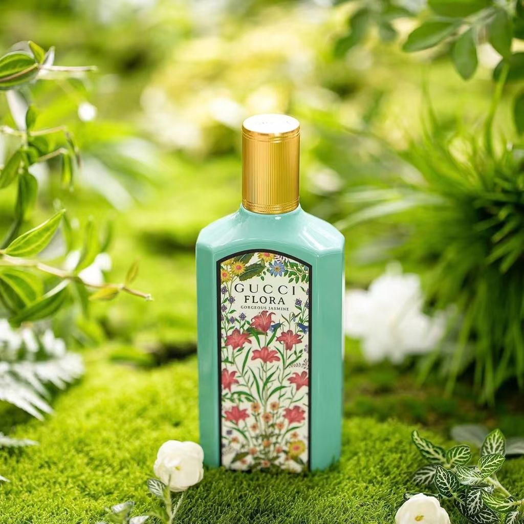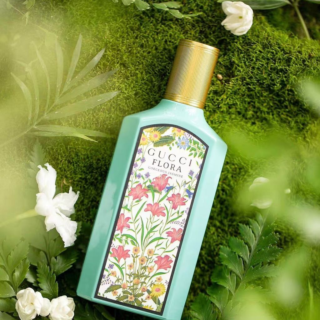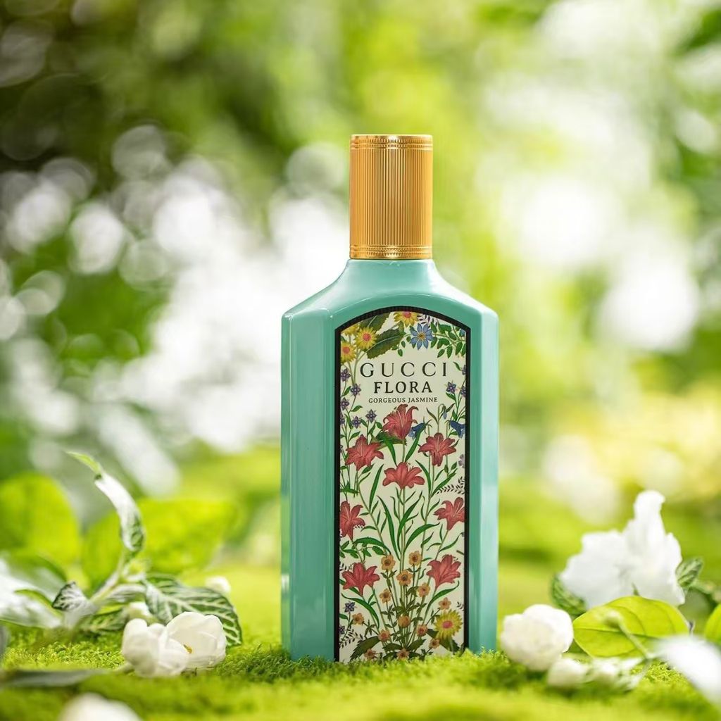 這瓶酒體現了GUCCI的標誌性美學——一個光滑的翡翠綠色的瓶子,裝飾著金色的Flora標誌,反映了香水的奢華和浪漫精神。