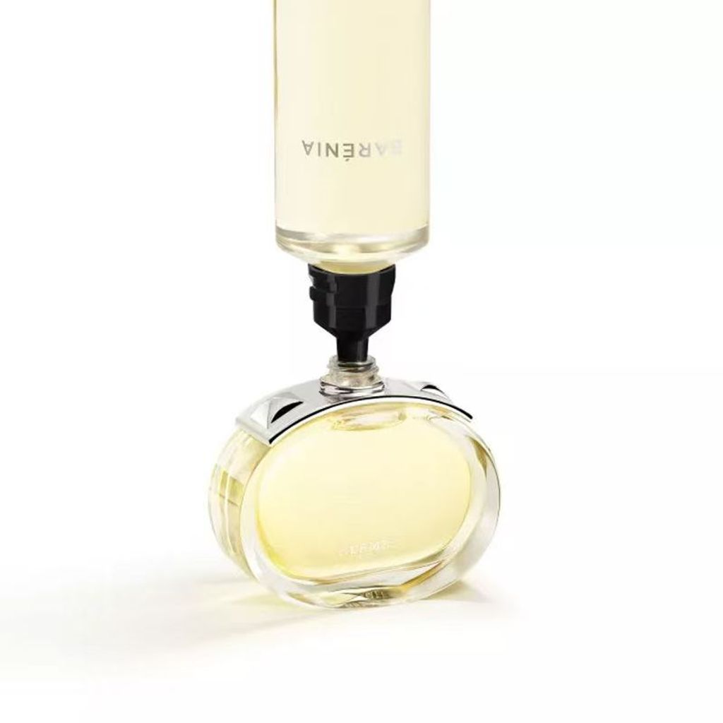 俏皮而精致的香水瓶与爱马仕标志性的丝巾相呼应——微型 Twilly 包裹在极简主义的瓶子上,象征着年轻的大胆和永恒的巴黎时尚。