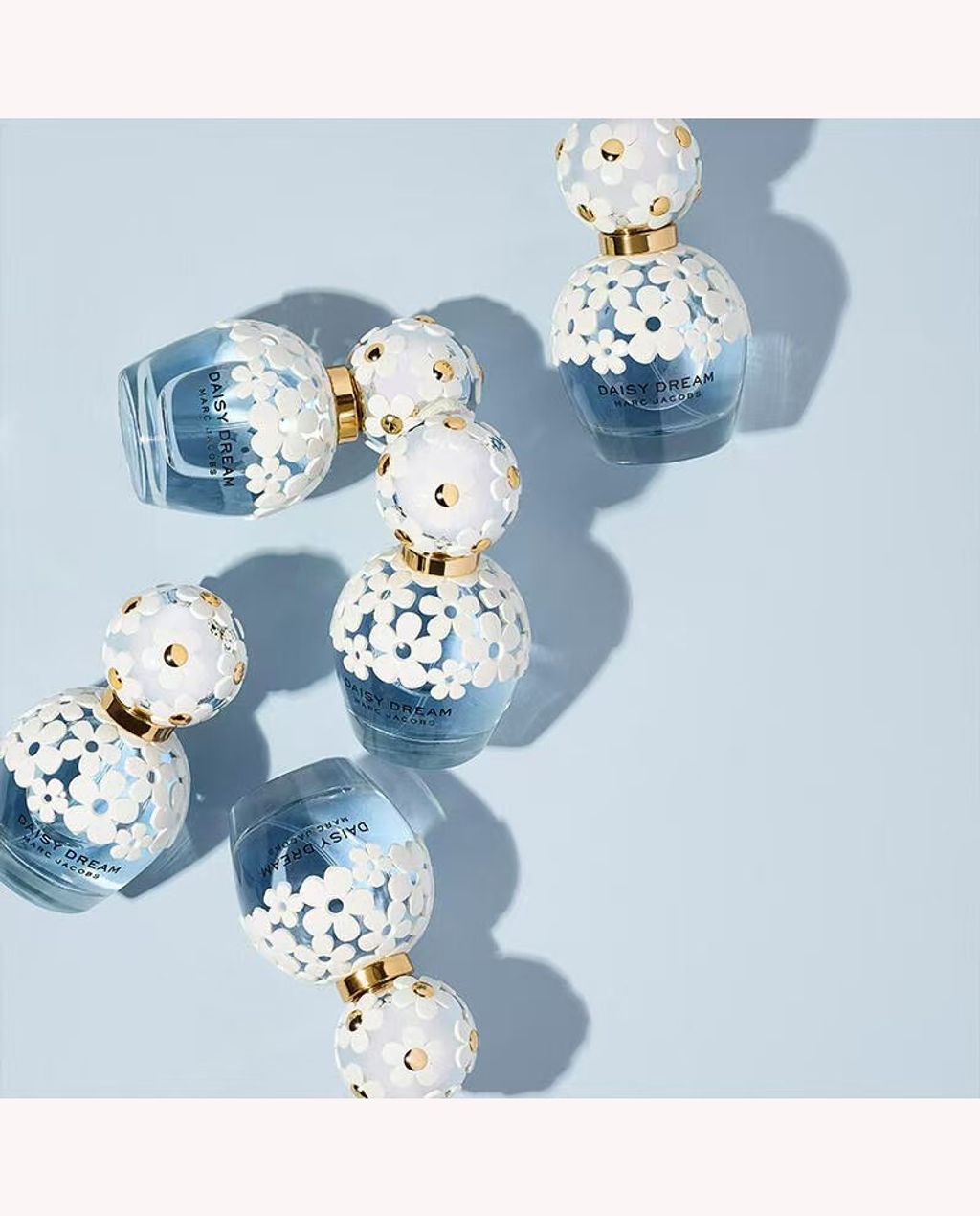 瓶身设计以梦幻的雏菊花为灵感,以柔和的蓝色调呈现,搭配经典的雏菊花帽和品牌标志,展现出低调的奢华和精湛的工艺。整体设计与香水的梦幻主题相呼应,完美体现了Marc Jacobs的时尚美学和品牌精神。