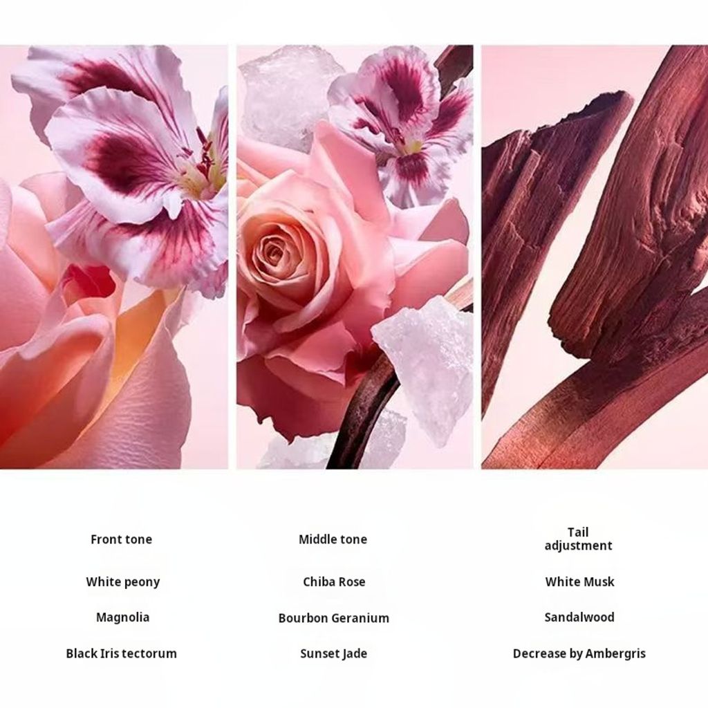 瓶子體現了極簡主義的別緻——光滑、曲線優美的輪廓,柔和的粉紅色色調,冠以微妙的黑色帽子。 向力量和優雅的二元性致敬,反映了香味的大膽而細膩的性格。